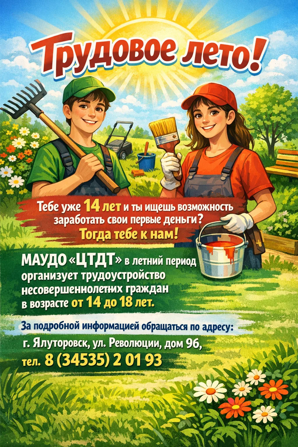 В нашу команду нужен педагогМуниципальное автономное учреждение дополнительного образования «Центр туризма и детского творчества»» приглашает на работу педагога дополнительного образования.Мы предлагаем работу по следующим направлениям: Техническое: робототехника, программирование, 3D-моделирование. Социально-гуманитарное: профессиональное самоопределение, волонтёрство, экономика и финансы, правовое просвещение. Естественнонаучное: экология, биология, экспериментальная физика/химия.Наши требования: Высшее или среднее профессиональное образование (педагогическое или профильное по направлению). Опыт работы с детьми будет преимуществом. Готовность к официальному трудоустройству (по ТК РФ). Ответственность, коммуникабельность. Навыки планирования и творческий подход к работе.Мы предлагаем: Стабильную заработную плату (оклад + стимулирующие надбавки). График работы: гибкий график. Оформление по ТК РФ (полный социальный пакет). Работу в дружном коллективе единомышленников. Помощь в адаптации и методическую поддержку.Контактная информация: Отправить резюме можно на электронную почту: yalctdt@obl72.ru с пометкой «Педагог ДО». Или позвонить по телефону:+7 (34535) 2-01-93