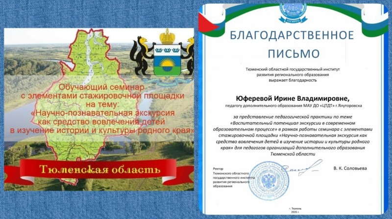А мы снова делимся опытом работы! 26 февраля в историческом парке «Россия – Моя история», в рамках повышения уровня профессиональной компетентности педагогических работников образовательных организаций реализиющих программы туристко-краеведческой направленности Тюменской области в вопросах организации научно-познавательных экскурсий по изучению исторического наследия и культурного богатства региона, педагог МАУДО «ЦТДТ» Юферева Ирина Владимировна, выступила в роли спикера по теме «Воспитательный потенциал экскурсии в современном образовательном процессе».