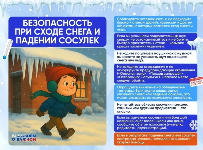 Безопасность при сходе снега и падении сосулекС наступлением весны увеличивается риск схода снега и падения сосулек с крыш зданий. Чтобы избежать несчастных случаев, важно соблюдать следующие меры предосторожности: Будьте внимательны: Не подходите близко к стенам зданий, карнизам и другим объектам, с которых возможен сход снега и льда. Осторожно передвигайтесь: Если вы услышали подозрительный шум сверху, остановитесь и не бегите. Быстро прижмитесь к стене — козырёк крыши послужит укрытием. Избегайте шума: Не ходите по улицам в наушниках с музыкой, чтобы не пропустить шум падающего снега или льда. Соблюдайте знаки: Не заходите за ограждения и не игнорируйте предупреждающие объявления, такие как «Опасная зона», «Проход запрещён», «Осторожно! Сосульки». Опасное место следует обойти. Обращайте внимание на следы: Если вы видите следы ранее упавшего снега или падающие сосульки, это может указывать на возможную опасность. Не пытайтесь сбивать сосульки: Не пытайтесь сбивать сосульки палками или другими предметами — это опасно. Сообщайте о проблеме: Если вы заметили сосульки или большой навес снега на крыше школы или дома, сообщите об этом взрослым (учителю, родителям, администрации). Действуйте быстро: Если в результате падения снега или сосулек пострадал человек, немедленно вызовите скорую помощь.Берегите себя и своих близких!
